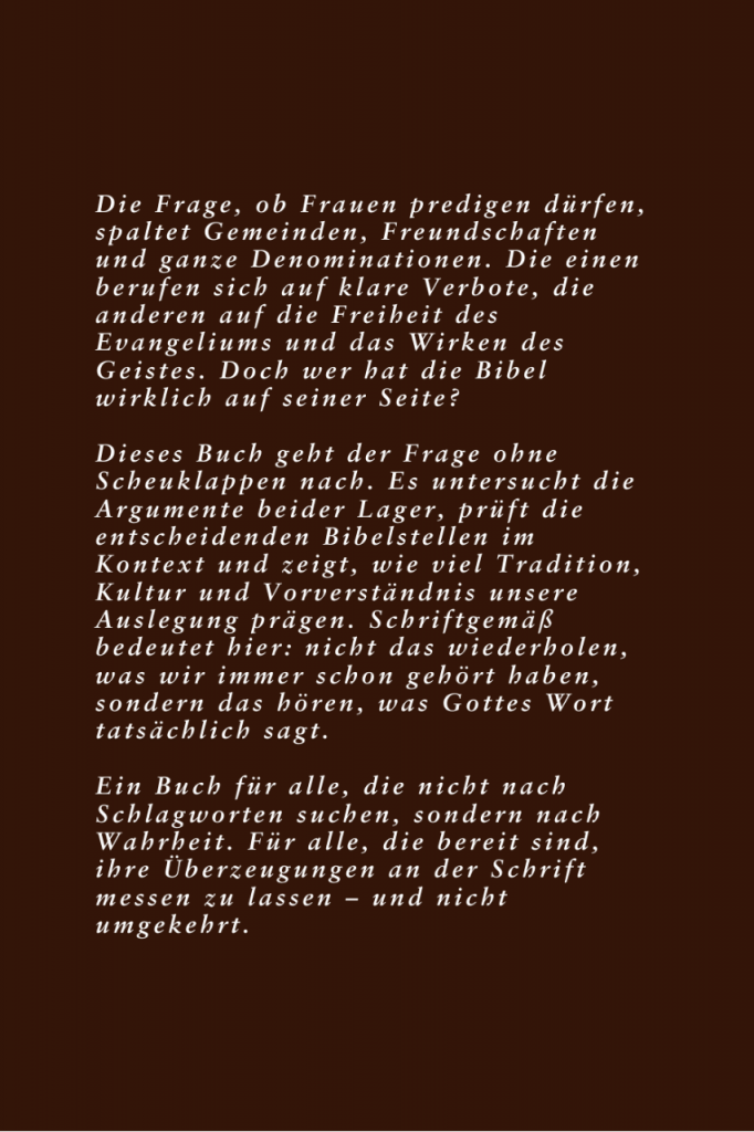 Hier eine weitere Buchempfehlung zum Thema “Dürfen Frauen predigen?” Die Frage, ob Frauen in der Gemeinde predigen und lehren dürfen, gehört zu jenen Themen, die christliche Gemeinden seit Jahrhunderten bewegen und spalten.
